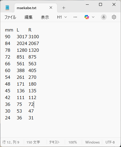 ②壁との距離を変えながらセンサの値を取得する。今回はロボットの前後方向の中心が柱の位置にある場所を45mmとして、ロボットが区間の中心にある場所を90mmとした。L列に左前センサの値、R列に右前センサの値を記録する