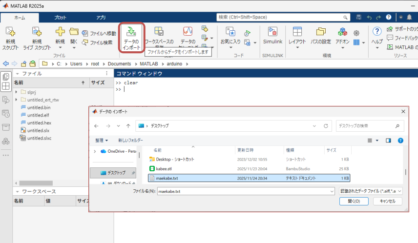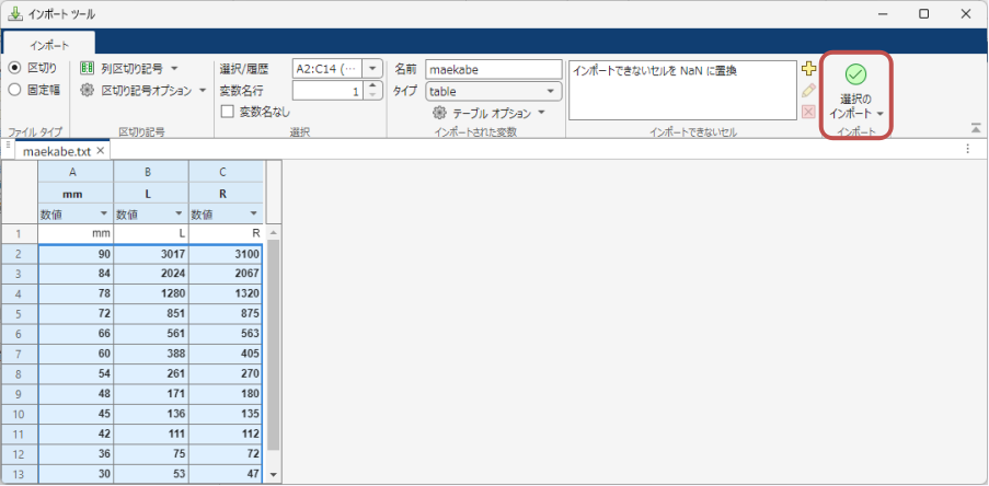 ④matlabを立ち上げてデータのインポートボタンを押して、③で作ったテキストファイルを選択する