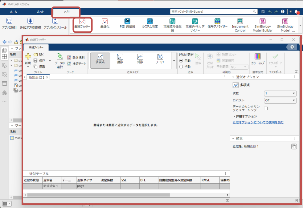 ⑥matlabメイン画面のアプリのタブに移動して、アプリの一覧から曲線フィッターを選択して、曲線フィッターを立ち上げる