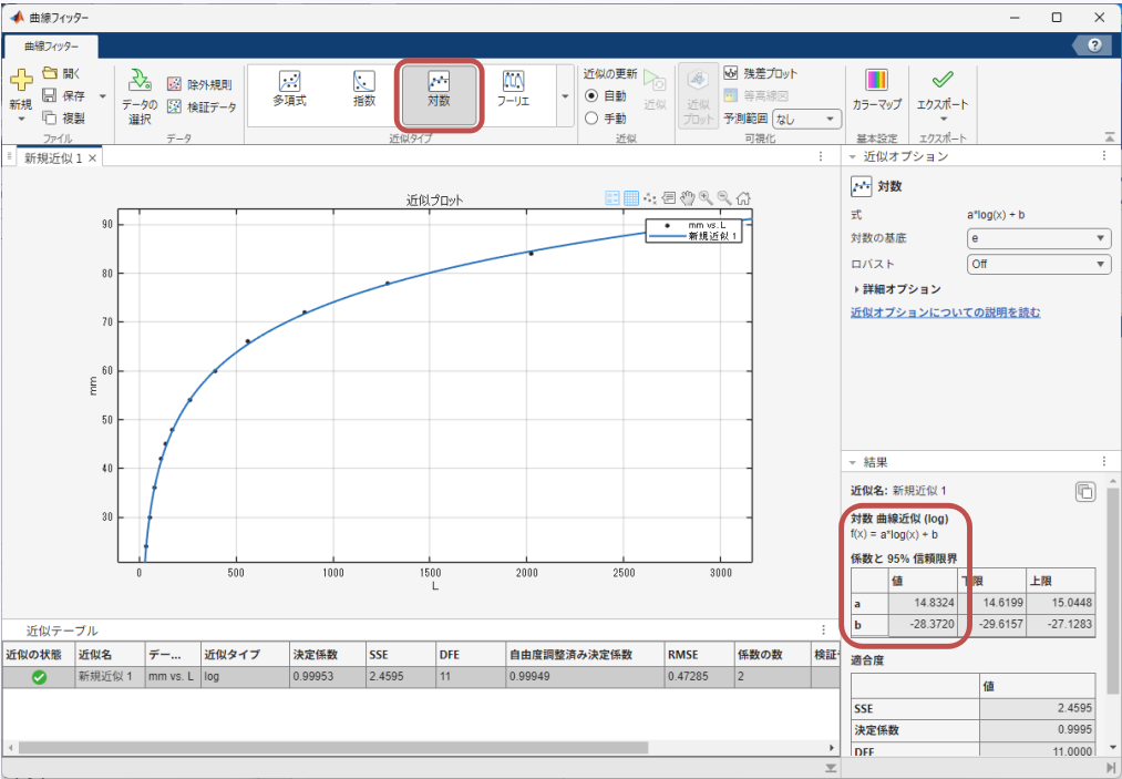 ⑧近似曲線から対数を選ぶとフィッティングされるので、右下の近似パラメーターの値a,bをメモする。