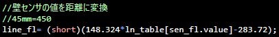 ちなみに去年までは壁センサからの値の常用対数そのまま利用していて制御的には困っていなかったけれど、物理量(距離)への変換をしていないため、壁との距離を直観的に把握することができなかったことが少し不便だった。