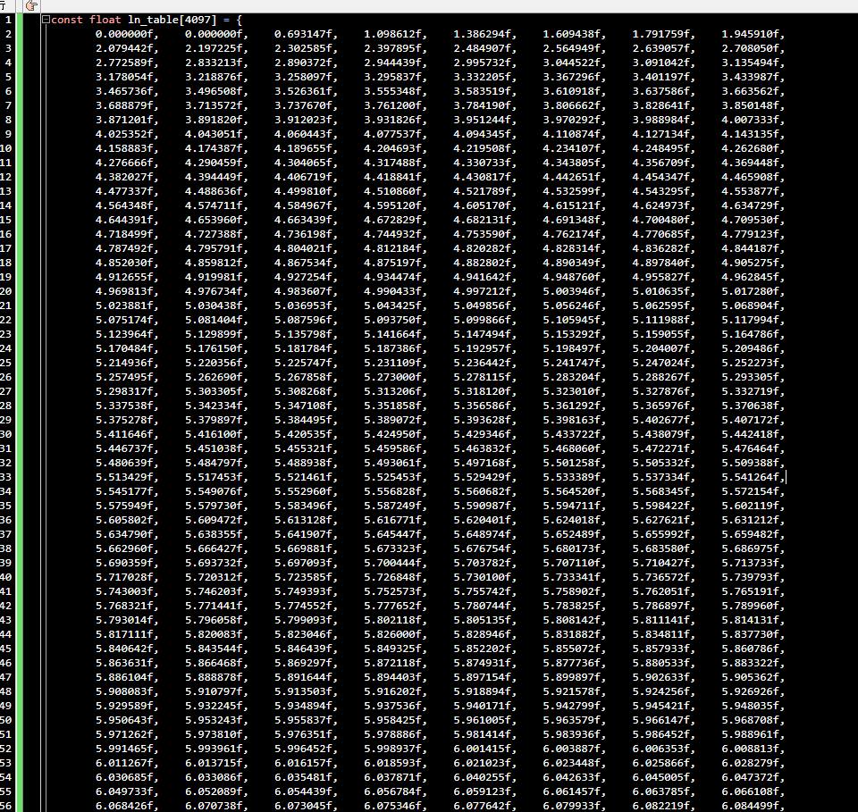 今回の実装では、自然対数の計算は遅いのでテーブルln_table[]を作成してそれを参照するようにし、
